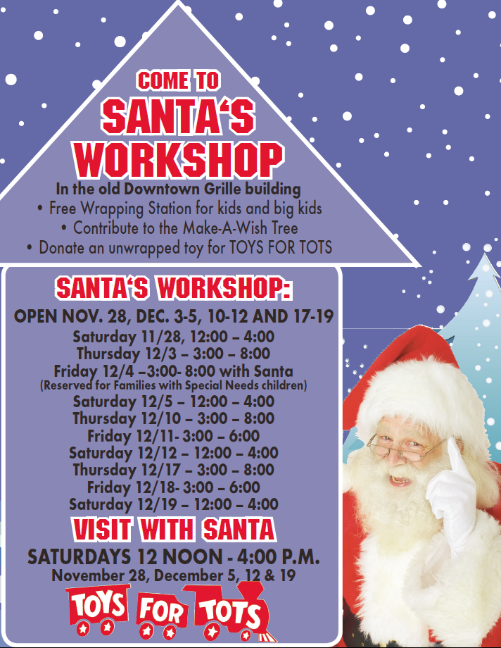 SANTA’S WORKSHOP is here!!!! Join us this Saturday(and every Saturday through December 19th) at the old Downtown Grill(128 East 2nd Street). This wonderful location has been transformed into Santa’s Workshop! Santa will be there, pictures will be taken and different kids activities will be happening each week! Shopping downtown? Wrap your gifts too!