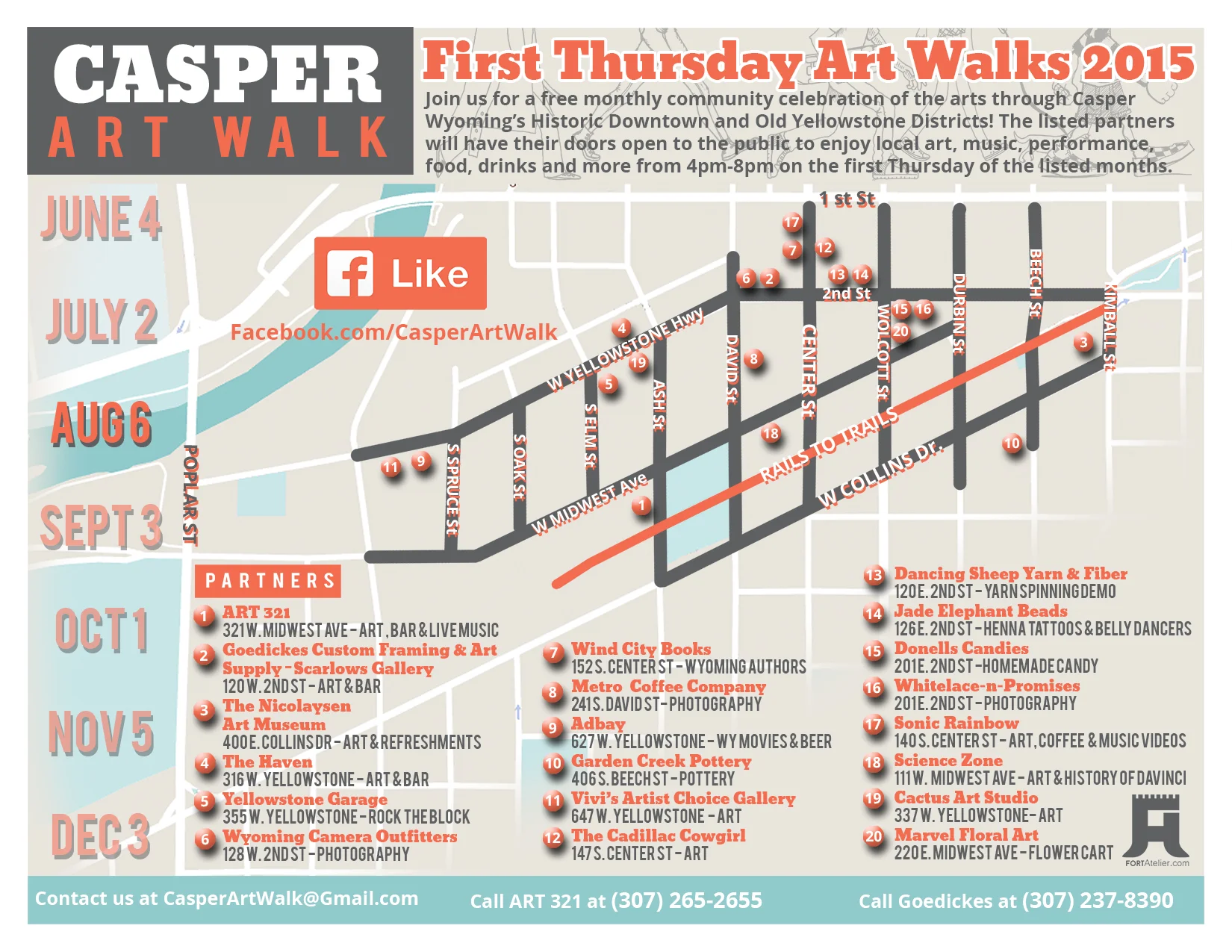 Downtown Casper Art Walk Thursday, September 3, 2015 5:00 PM 9:00 PM 17:00 21:00 Google Calendar ICS Join downtown Casper businesses for a great night of art, community, food, drink and fun!! Over 20 participating businesses, each one with their own special event and exhibit! Check out Casper Art Walk's Facebook page for full details!https://www.facebook.com/CasperArtWalk