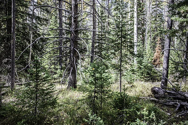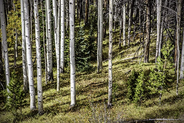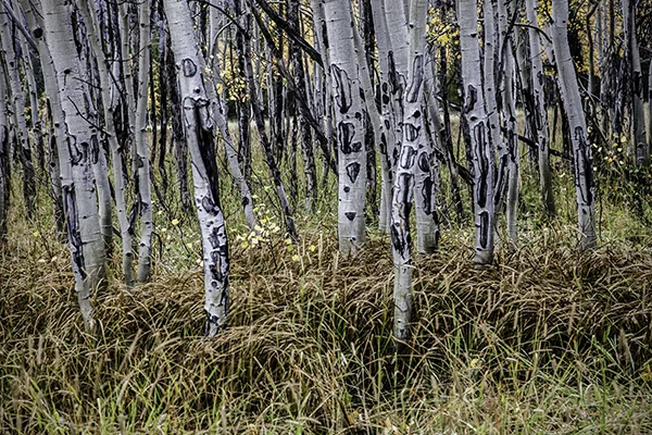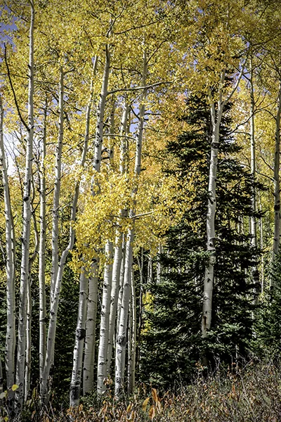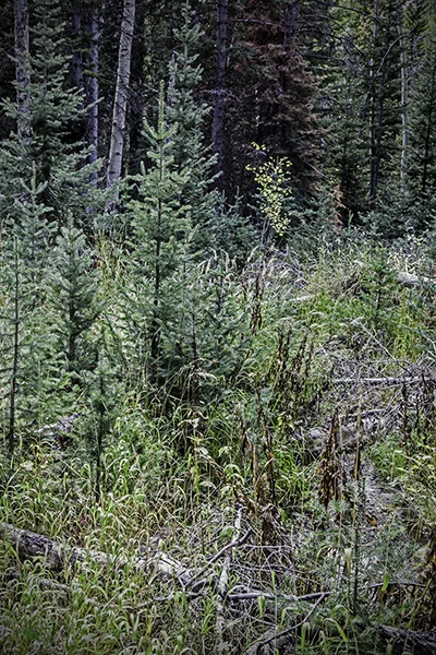 The best time to be in aspen country is during the peak season for color. In Wyoming this is likely to be in late September. Aspen country is best experienced on foot in the backcountry where the only trails are made by elk, deer and other wild animals. Wyoming is rich with this kind of aspen country. In Wyoming, at these times and places, the annual ritual of elk rut is in full swing. The further one wanders from the jeep trails the more likely one is to experience the sounds of bull elk bugling, cow elk mewing and antlers clanging against other antlers or young trees. The sound of an elk bugle can quite accurately be described as ethereal. If one is even more fortunate one might see the creatures as they are making these sounds. To increase your chance of having such an experience it is advisable to leave your camp and begin hiking in the dark, while Orion is still looking down upon you and stars are shooting across the sky above. Having considerable experience being in such places during such times without a camera, I'd found myself contemplating the kind of photographs that I might make if I did have a camera. This year I made it a point to find myself in aspen country at such a time with a camera. Aspen Country is not about the wildlife, although aspen country is all the more special because of the wildlife. My Aspen Country photographic story is about the country itself. It is primarily, although not exclusively, a story about a trail less place experienced from before daylight and on through a long day spent traveling on foot up and down the hills and drainages. It is the kind of place that one might seek out if one was looking for an experience of the thread that holds the universe together.